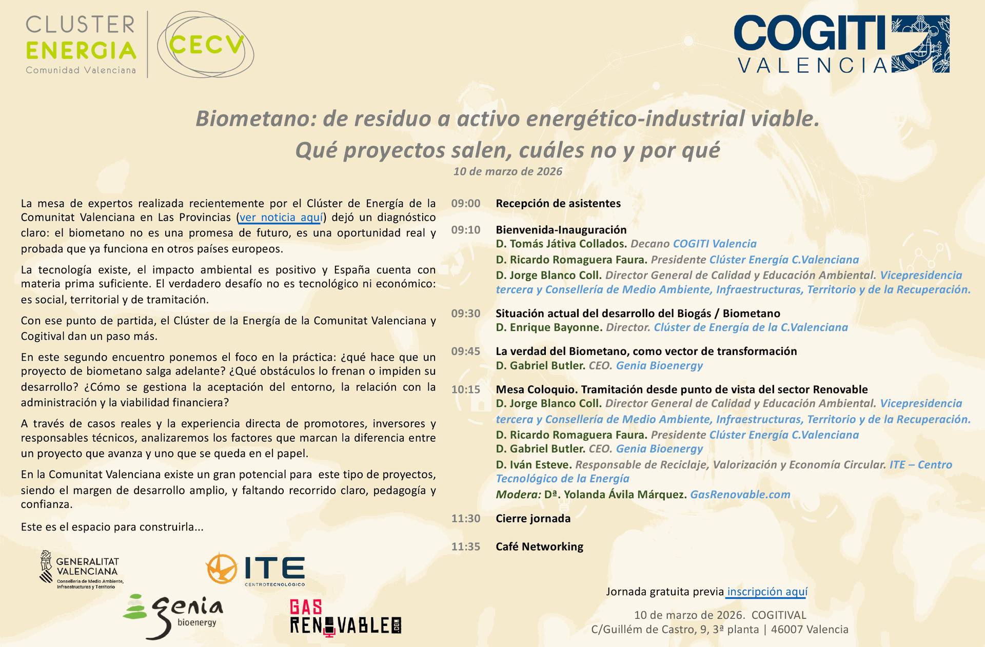 La jornada está dirigida a profesionales del sector energético, industria, promotores, inversores y administraciones públicas interesados en comprender los factores que determinan la viabilidad de los proyectos de biometano.