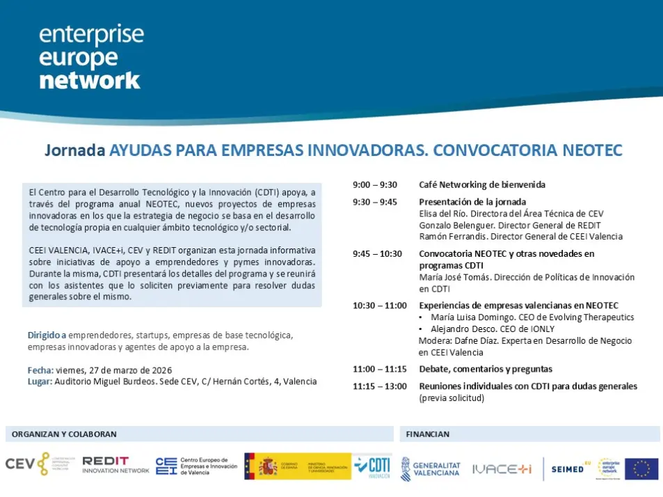 En esta jornada organizada por CEEI Valencia, IVACE+i, CEV y REDIT conocerás de primera mano los detalles del programa, casos reales de empresas valencianas y las últimas novedades en ayudas a la I+D. Además, podrás solicitar una reunión individual con CDTI para resolver tus dudas. Una oportunidad clave para transformar tu tecnología en crecimiento. ¡Reserva tu plaza!
